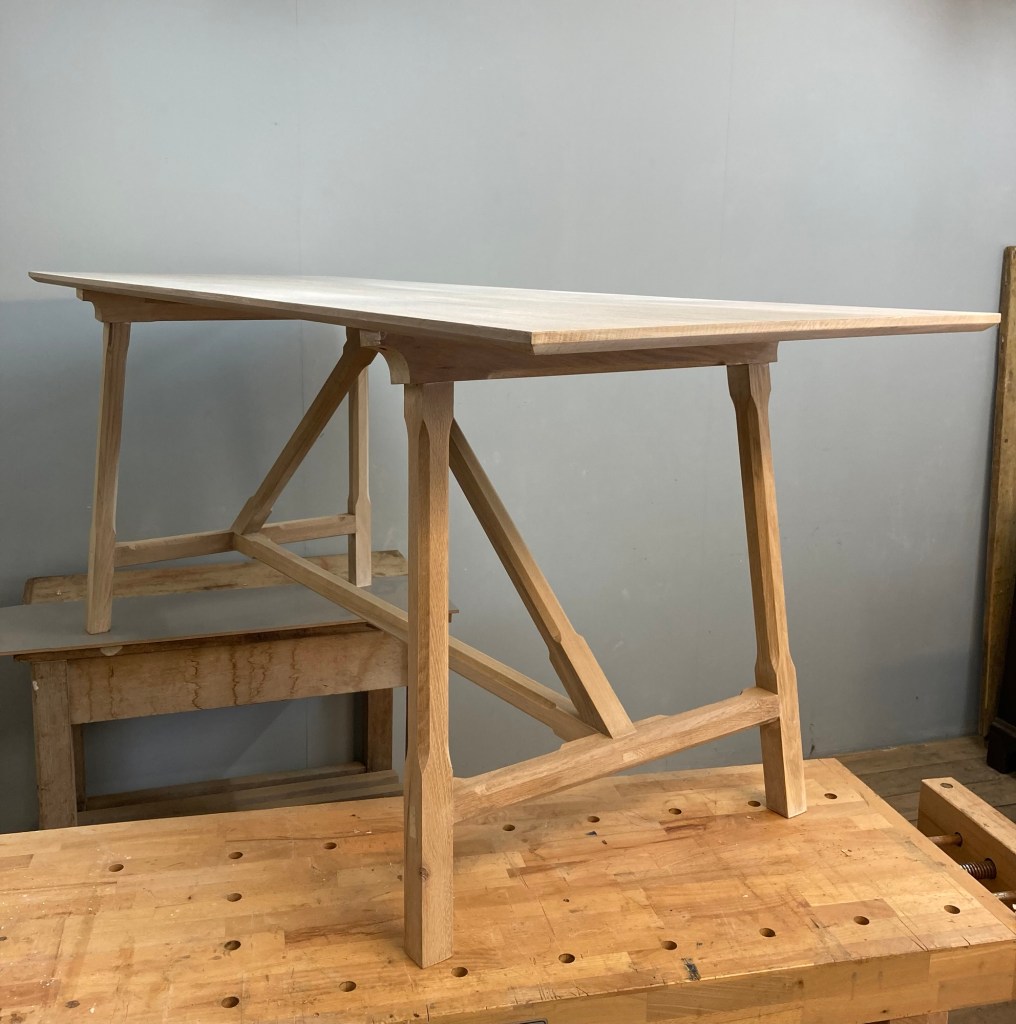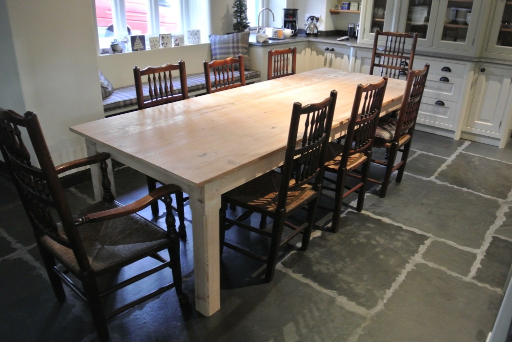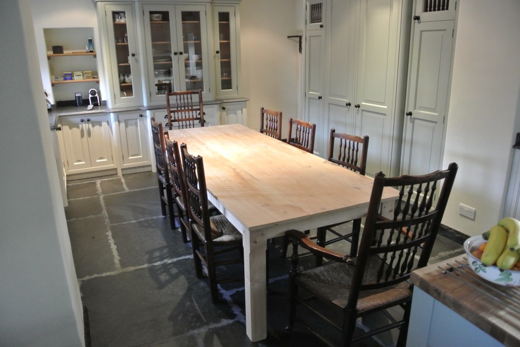 Commission for a large pine kitchen table, very simple neat lines, with stopped chamfered 4″ square legs and fine pencil moulding on the rails.