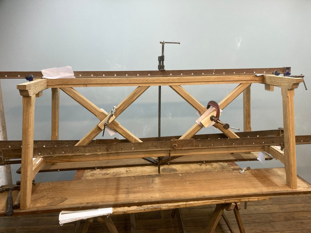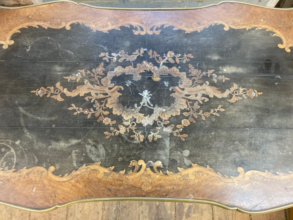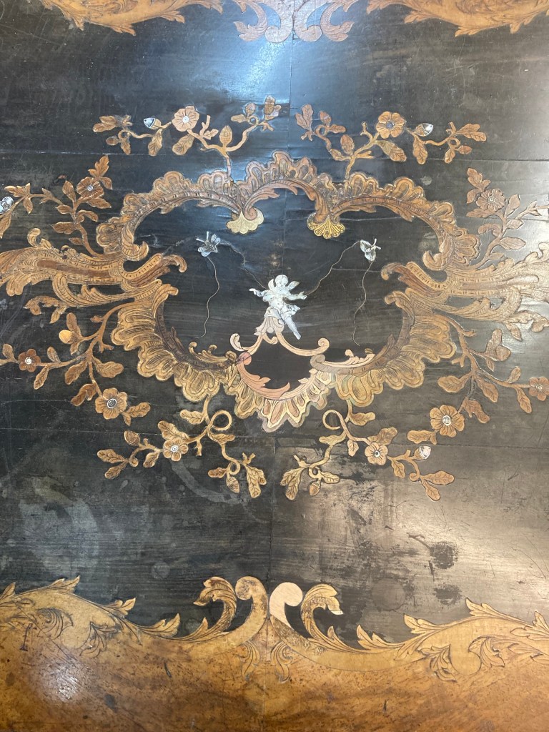 Tricky marquetry restoration on a fine 19th century inlayed table top. Matched veneer handcut on a treadle fretsaw , prior to colour matching.