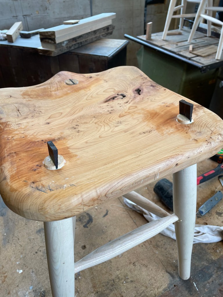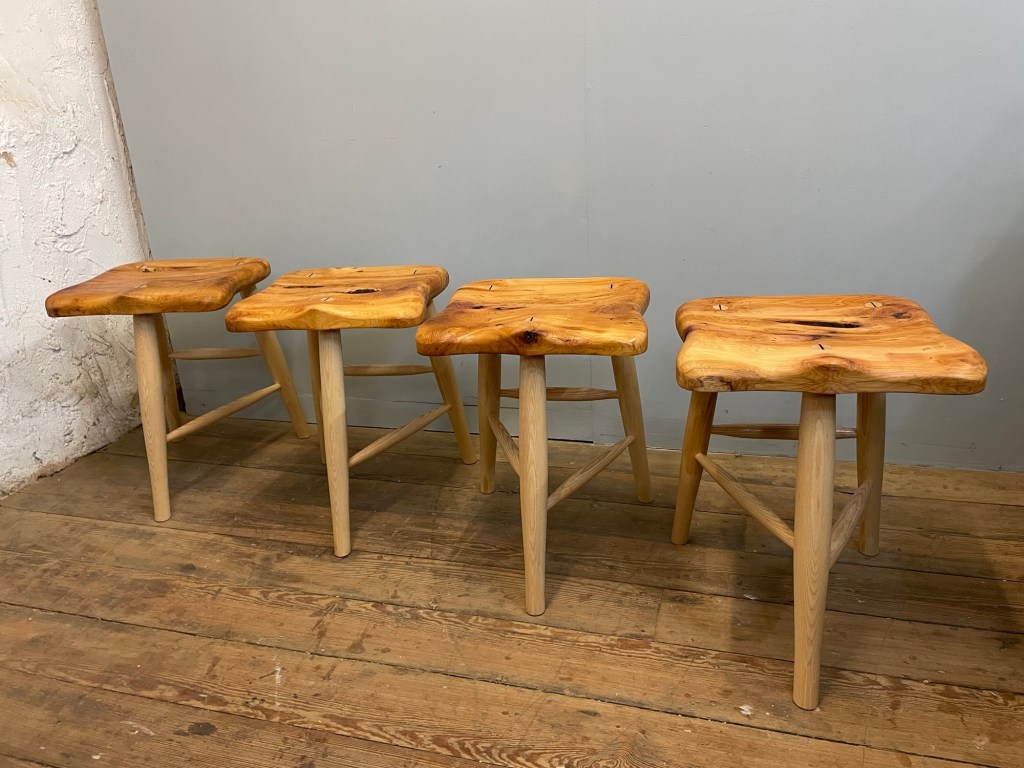 A lovely commission – 4 dining stools , hand shaped saddle seats in Yew with turned ash legs and stretchers and ebony wedges